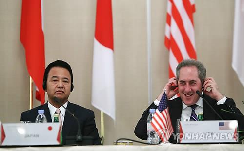 | △ 작년 5월 싱가포르에서 열린 TPP각료회의에서 나란히 앉은 마이클 프로먼 미국무역대표부(USTR) 대표(오른쪽)와 아마리 아키라(甘利明) 일본 TPP 담당상(EPA.연합뉴스.자료사진) |