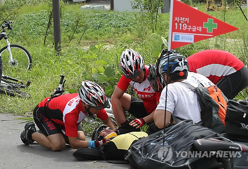 | △ 행락철인 5~7월에 자전거 교통사고가 급증하는 것으로 조사됐다. 사진은 119 자전거 구급대원들과 동호인들이 응급처치 시범을 하고 있다.(연합뉴스 자료사진) |