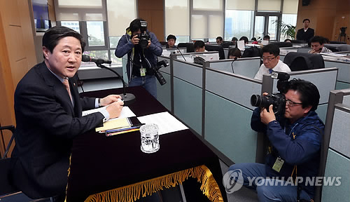 | △ 유기준 해수장관, 기자단 간담회 (세종=연합뉴스) 배재만 기자 = 유기준 해양수산부 장관이 20일 오후 정부세종청사 해수부 기자실에서 열린 출입기자단 간담회에서 세월호 선체인양 결정을 위해 중앙재난안전대책본부에 심의를 요청했다고 밝히고 있다. |