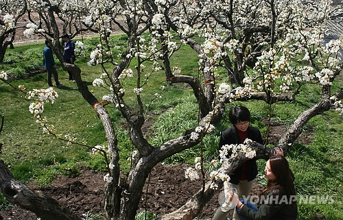 | △ 수령 100년 넘는 배나무들 (영동=연합뉴스) 박병기 기자 = 충북 영동 과일나라테마공원 예정 부지 안에 100살 넘은 배나무 20그루가 건강한 모습으로 보호받고 있어 눈길을 끈다. 지난 17일 하얀 꽃이 핀 배나무 아래서 시민들이 사진을 촬영하고 있다. 2015.4.20 bgipark@yna.co.kr |