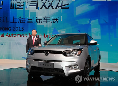 | △ 쌍용차, 상하이 모터쇼서 '티볼리' 첫선 (서울=연합뉴스) 최종식 쌍용자동차 대표이사가 20일 중국 상하이 컨벤션센터에서 열린 '2015 상하이 국제모터쇼'에서 티볼리(현지명 티볼란)와 포즈를 취하고 있다. (쌍용차 제공) |