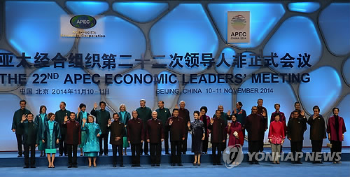 | △ 기념촬영하는 APEC 정상들· (베이징=연합뉴스) 이정훈 기자 = APEC 정상회의에 참석중인 박근혜 대통령을 비롯한 각국 정상들이 10일 오후 중국 베이징 워터큐브에서 열리는 갈라만찬에 앞서 기념촬영을 하고 있다. 앞줄 왼쪽부터 쯔엉떤상 베트남 국가주석, 엔리케 페냐 니에토 멕시코 대통령 내외, 미첼 바첼레트 칠레 대통령, 하사날 볼키아 브루나이 국왕, 베니그노 아키노 필리핀 대통령,블라디미르 푸틴 러시아 대통령, 시진핑 중국 국가주석 내외, 조코 위도도 인도네시아 대통령 내외, 버락 오바마 미국 대통령, 박근혜 대통령, 오얀타 우말라 페루 대통령, 프라윳 찬-오차 태국 총리 내외. 뒷줄 왼쪽부터 렁 춘잉 홍콩 행정장관, 존 키 뉴질랜드 총리 내외, 아베 신조 일본 총리 내외, 스티븐 하퍼 캐나다 총리 내외, 토니 애벗 호주총리, 나집 라작 말레이시아 총리 내외, 피터 오닐 파푸아뉴기니 총리 내외, 리셴룽 싱가포르총리 내외, 샤오 완 창 대만 전 부총통 내외. 2014.11.10 uwg806@yna.co.kr |