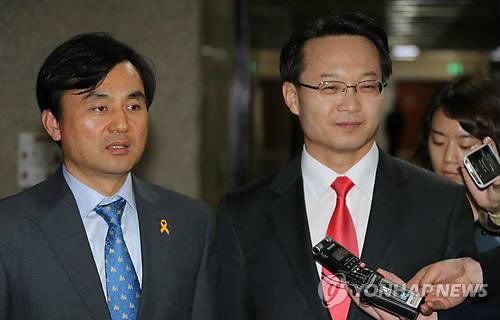 | △ 여야 원내수석 회동 (서울=연합뉴스) 백승렬 기자 = 새누리당 조해진(오른쪽)·새정치민주연합 안규백 원내수석부대표가 20일 국회 새정치민주연합 원내수석부대표실 앞에서 만나 취재진의 질문에 답변하고 있다. |
