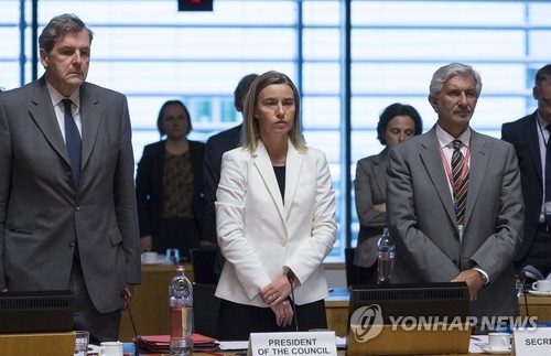 | △ 룩셈부르크에서 열린 EU 특별 합동회의에 참석한 페데리카 모게리니 EU 외교안보 고위대표(가운데) (AP=연합뉴스) |