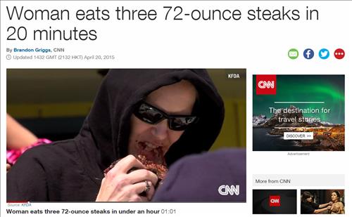 체중 56㎏ 미국 여성, 20분만에 스테이크 6㎏ '꿀꺽'