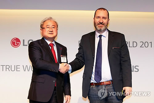 | △ 악수하는 김대훈 LG CNS 대표이사-케빈 애슈턴 (서울=연합뉴스) 21일 오전 서울 강남구 삼성동 그랜드인터컨티넨탈호텔에서 열린 '엔트루월드 2015'에서 김대훈 LG CNS 대표이사(왼쪽)와 사물인터넷(IoT) 개념의 창시자인 케빈 애슈턴이 악수하고 있다. 2015.4.21 << LG CNS 제공 >> photo@yna.co.kr |