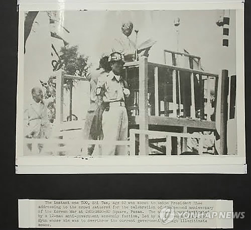 (뉴욕=연합뉴스) 박성제 특파원 = 1952년 이승만 대통령 암살 시도 장면을 포착한 사진이 20일(현지시간) 미국에서 공개됐다.