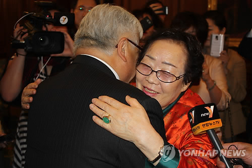 | △ 포옹하는 마이크 혼다 의원과 이용수 위안부 할머니 (워싱턴=연합뉴스) 노효동 특파원 = 지난 2007년 미국 하원의 일본군 위안부 결의안 통과의 주역인 마이크 혼다(민주·캘리포니아) 의원과 같은 해 미국 하원 청문회에 나와 증언했던 일본군 위안부 피해자 이용수(87) 할머니가 21일(현지시각) 미국 하원에서 만나 포옹하고 있다. 2015.4.22 rhd@yna.co.kr |