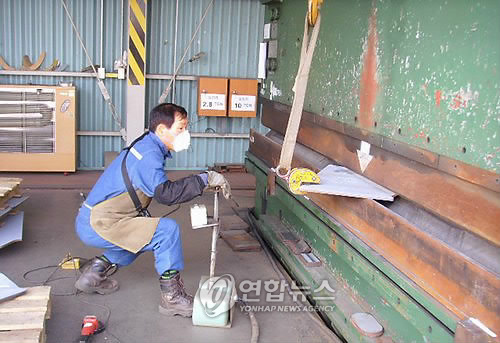 | △ 소아마비를 앓아 다리가 불편한 장애인이 프레스를 조작하고 있다.(연합뉴스 자료사진) |