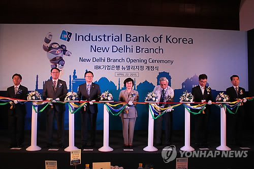 | △ IBK기업은행 뉴델리지점 개점 (뉴델리=연합뉴스) 나확진 특파원 = 22일(현지시간) 인도 뉴델리에서 IBK기업은행 뉴델리지점 개점행사가 열리고 있다. 사진 왼쪽부터 방태일 기업은행 뉴델리지점장, 성기웅 포스코인디아 사장, 이준규 주인도 한국대사, 권선주 기업은행장, 키쉬아르 인도중앙은행 뉴델리본부장, 구상수 재인도한인회장, 윤준구 기업은행 부행장. 2015.4.22 rao@yna.co.kr |