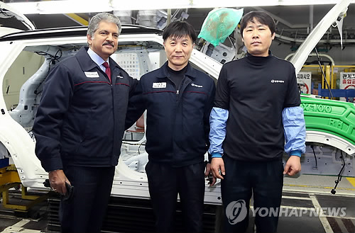 | △ 인도언론 "마힌드라, 2천600억 투입해 쌍용차 지분 늘린다" (서울=연합뉴스) 쌍용차[003620] 최대주주인 인도 마힌드라그룹이 쌍용차 지분을 현행 72.85%에서 85%로 늘리기로 했다고 인도 경제방송 CNBC-TV18이 22일(현지시간) 보도했다. 사진은 마힌드라 그룹의 아난드 마힌드라 회장이 지난 1월 14일 경기도 평택시 쌍용자동차 평택공장을 방문, 근무자들을 격려한 후 기념 촬영을 하는 모습. 2015.4.23 << 쌍용차 제공 >> photo@yna.co.kr |