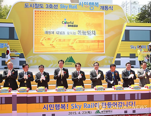 | △ 대구도시철도 3호선 개통 (대구=연합뉴스) 한무선 기자 = 23일 대구시 수성구 황금동 어린이회관 광장에서 대구도시철도 3호선이 개통식이 열렸다. 2015.4.23 mshan@yna.co.kr |
