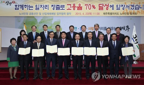 (제주=연합뉴스) 김호천 안승섭 기자 = 제주지역 노동계·경영계·시민사회단체·행정기관은 23일 좋은 일자리 창출과 고용 안정, 경제 활성화 등을 위해 공동 노력하고 전국 제일의 '산업평화의 섬 제주'를 만드는 데 앞장설 것을 결의했다.