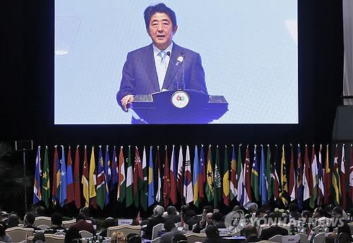 | △ (자카르타 AP=연합뉴스) 아베 신조 일본 총리가 2015년 4월 22일(현지시간) 인도네시아 자카르타에서 열린 아시아 아프리카 정상회의에서 연설하고 있다. |