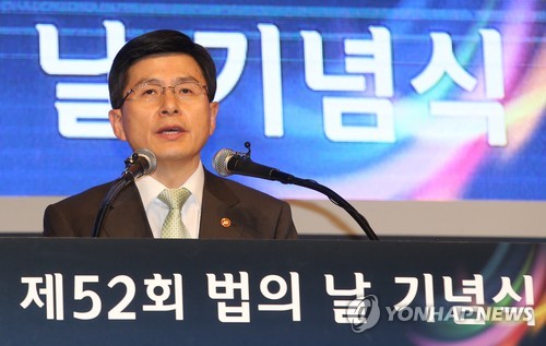 | △ 기념사하는 황교안 법무부 장관 (서울=연합뉴스) 임헌정 기자 = 황교안 법무부 장관이 24일 서울 서초동 대검찰청에서 열린 제52회 법의날 기념식에서 기념사를 하고 있다. |