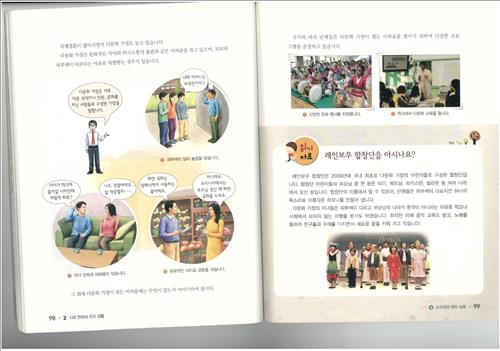 24일 한국다문화센터에 따르면 레인보우합창단은 올해 개편된 초등학교 3∼4학년용 사회 국정교과서에 읽기 자료로 소개됐고, 교학사의 중학교 기술가정 교과서에도 공연 사진이 실렸다.