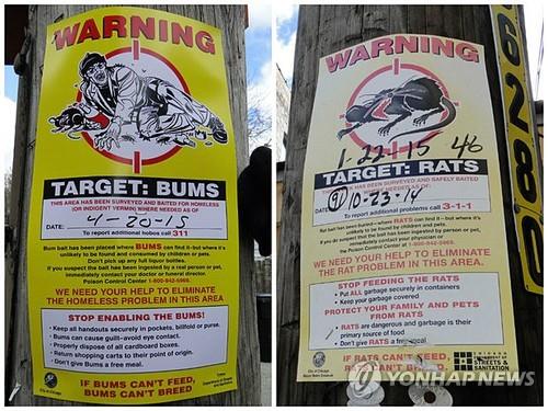 (시카고=연합뉴스) 김 현 통신원 = 미국 시카고 주택가에 노숙자를 쥐에 빗댄 '노숙자 퇴치 운동' 포스터가 나붙어 논란이 일고 있다.