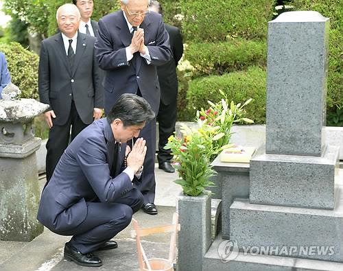 | △ 아베 신조(安倍晋三) 일본 총리가 작년 8월 12일 자신의 지역구가 있는 야마구치(山口)현에 위치한 외조부 기시 노부스케(岸信介·1896∼1987) 전 총리의 묘 앞에서 두 손을 모으고 있는 모습.(교도.연합뉴스.자료사진) |