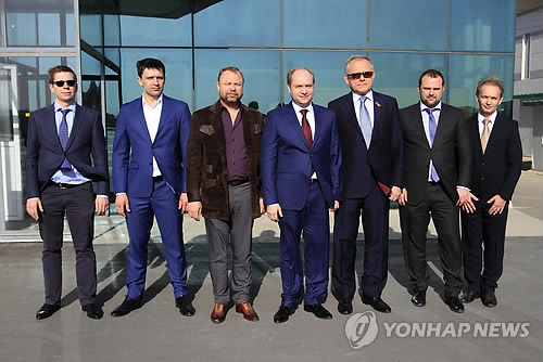| △ 알렉산드르 갈루슈카(가운데) 러시아 극동개발부 장관을 단장으로 한 러시아 경제대표단이 24일 평양의 순안 국제공항에 도착했다. 2015.4.25.<< 연합뉴스DB >> |