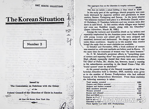 | △ 3.1운동 이후 일본경찰 성고문 기술한 미국 문서 (뉴욕=연합뉴스) 박성제 특파원 = 3·1운동 이후에 일본 제국주의 경찰들이 당시 한국(조선) 여학생들을 대상으로 성고문까지 했다는 사실을 기록한 미국 교회연합회(Federal Council of the Churches of Christ in America)의 문서가 미국 뉴욕 맨해튼의 뉴욕한인교회에서 발견됐다. 한국에서 진행된 독립운동 현황과 일본의 대응, 외국에서의 독립운동 등을 기술하고 있는 이 문서에는 일본 경찰이 한국의 젊은 여성과 여학생들을 심문하면서 옷을 벗기고 고문했다는 기록을 담고 있다. 사진 왼쪽은 문서 표지, 오른쪽은 해당 내용이 기술된 페이지. |