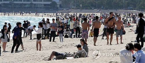 | △ 4월 무더위 해운대 북적 (부산=연합뉴스) 조정호 기자 = 초여름 날씨를 보인 26일 부산 해운대해수욕장에서 나들이객들이 더위를 식히고 있다. 2015.4.26 ccho@yna.co.kr |