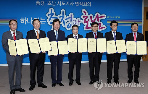| △ 충청·호남 7개 광역단체장 연석회의 (대전=연합뉴스) 김준호 기자 = 충청과 호남 7개 광역자치단체가 전북 익산에서 운행이 중단된 '서대전역 경유 호남선 KTX'의 연장과 '서대전역∼익산역 구간 직선화'를 위해 뭉쳤다. 26일 오후 3시 충청·호남 시·도지사들이 대전시청 5층 대회의실에서 연석회의를 마친 뒤 작성한 공동합의문을 들고 기념촬영을 하고 있다.2015.4.26 kjunho@yna.co.kr |