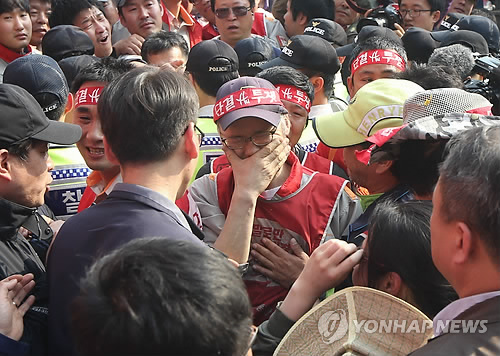| △ '80일간의 고공농성' 종료 (서울=연합뉴스) 김주성 기자 = 서울 소공동 서울중앙우체국 옆 광고탑에서 80일간 고공농성을 벌인 장연의 SK브로드밴드 비정규직지부 연대팀장이 26일 오후 고공농성을 종료한 뒤 크레인을 타고 광고탑에서 내려와 눈물을 흘리고 있다. 2015.4.26 utzza@yna.co.kr |