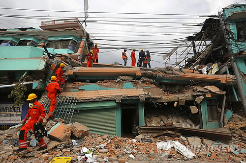 | △ 印 재난구호팀, 네팔 대지진 구조 현장 투입 (카트만두 AP=연합뉴스) 인도의 재난구호팀이 대지진 참사가 발생한 네팔 카트만두에 도착, 26일(현지시간) 건물 붕괴 현장에서 생존자 수색작업을 펴고 있다. |