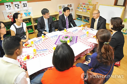 | △ 문형표 장관, 어린이집 현장방문 (서울=연합뉴스) 문형표 보건복지부 장관이 27일 오후 서울 동대문구 해오름어린이집을 방문, 어린이집에 대한 학부모, 어린이집 원장의 의견을 청취하고 있다. (보건복지부 제공) |
