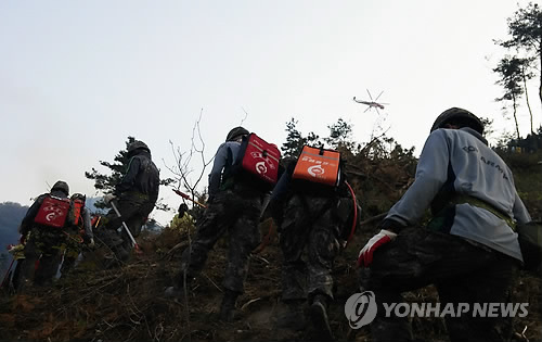 | △ 산불현장에 투입되는 군부대 장병 (옥천=연합뉴스) 박병기 기자 = 26일 낮 12시께 충북 옥천군 이원면 원동리의 월이산에서 불이 나 3㏊의 산림이 불탔다. 지원에 나선 군부대 장병들이 진화장비를 짊어지고 산불현장에 투입되고 있다. 2015.4.26 bgipark@yna.co.kr |