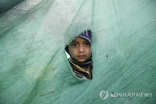 | △ 대참사 속 아이의 눈빛… (카트만두 EPA=연합뉴스) 27일(현지시간) 대지진이 강타한 네팔 수도 카트만두에서 찢어진 천막 사이로 한 어린이가 카메라를 응시하고 있다. 지난 25일 발생한 지진으로 인한 사망자가 3천200명을 넘어섰다. 2010596@yna.co.kr |
