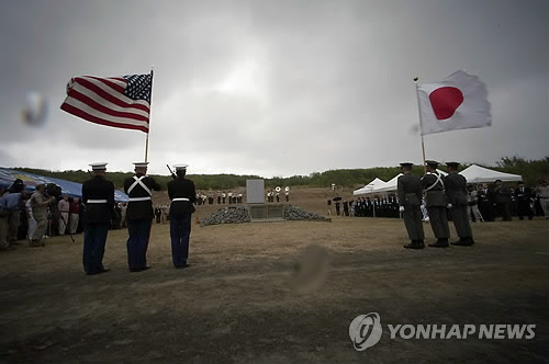 | △ (AP=연합뉴스) 미군 해병대와 일본군 자위대 의장대 기수들이 2015년 3월 21일일본 이오(硫黃) 섬에서 비가 내리는 가운데 각각 자국 기를 들고 2차대전 기간의 격전의 하나였던 이오섬 전투 70주년을 기리고 있다. |