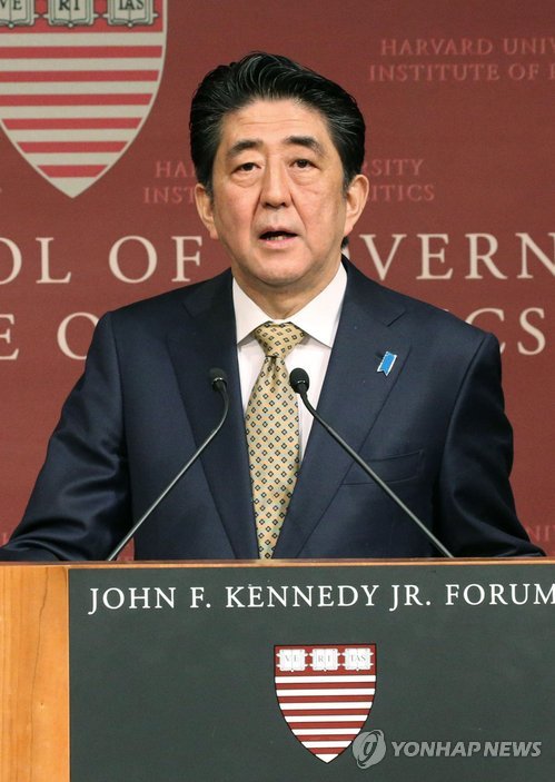 | △ (케임브리지<미국 매사추세츠> 교도=연합뉴스) 아베 신조(安倍晋三) 일본 총리가 27일(현지시간) 미국 하버드대에서 강연하고 있다. |