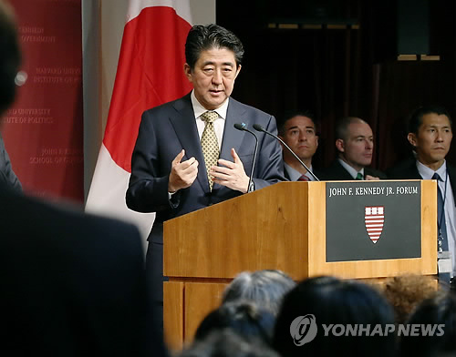 | △ 하버드대서 강연하는 아베 총리 (케임브리지<미국 매사추세츠> 교도=연합뉴스) 아베 신조(安倍晋三) 일본 총리가 27일(현지시간) 미국 하버드대에서 강연하며 학생의 질의에 응하고 있다 . sewonlee@yna.co.kr |