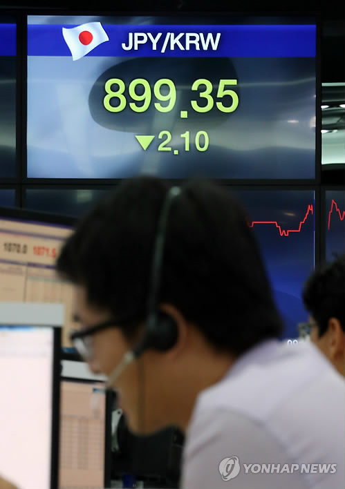 | △ 엔 환율 장중 900원선 붕괴 (서울=연합뉴스) 홍해인 기자 = 원·엔 환율이 28일 장중 100엔당 800원대에 진입했다. 이날 오전 9시 기준 원·엔 재정환율은 100엔당 897.28원으로 전일 오후 3시 기준 거래가격 대비 5.01원 급락했다. 장중에 공식적인 원·엔 재정환율이 800원대에 들어선 것은 7년 2개월 만에 처음이다. 사진은 이날 오전 서울 을지로 외환은행 본점 딜링룸. 2015.4.28 hihong@yna.co.kr |