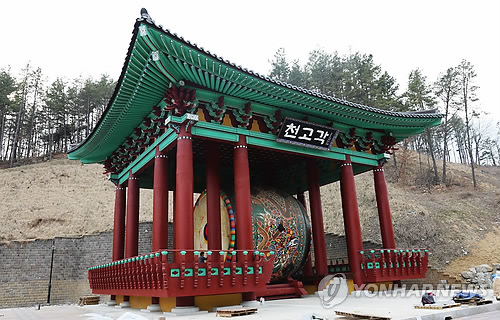 | △ 세계 최대 북 '천고' 새집 마련 (영동=연합뉴스) 박병기 기자 = 충북 영동서 만들어진 세계에서 가장 큰 북 '천고'(天鼓)가 국악제작촌 안에 새집을 마련했다. 사진은 28일 새 고각에 옮겨진 천고의 모습.2015.4.28 bgipark@yna.co.kr |