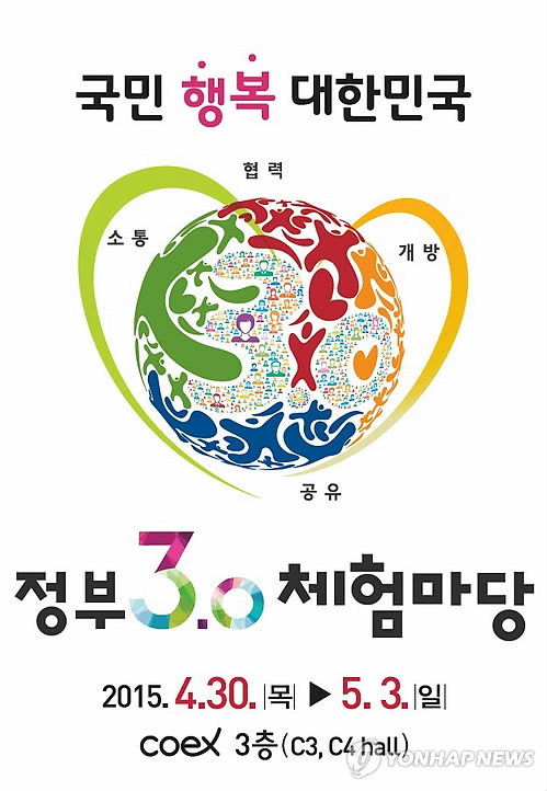 | △ (서울=연합뉴스) 행정자치부는 44개 중앙행정기관과 17개 시도가 정부3.0의 공감대를 확산하고 지난 2년여의 추진 성과를 소개하는 '정부3.0 체험마당'을 오는 30일부터 나흘간 코엑스에서 개최한다고 28일 밝혔다. 정부3.0이란 공유·개방·소통·협력의 원리에 따라 부처·기관 간 칸막이를 제거해 맞춤형 대국민 서비스를 구현하고 창조경제에 기여하는 박근혜 정부의 정부혁신전략을 일컫는다. 2015.4.28 << 행정자치부 제공 >> photo@yna.co.kr |