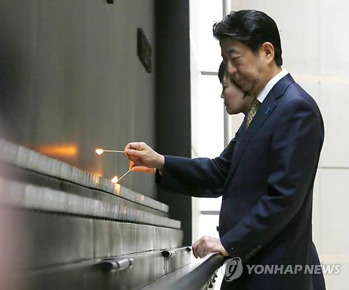| △ (워싱턴 교도=연합뉴스) 아베 신조(安倍晋三) 일본 총리와 부인 아키에(昭惠) 여사가 27일(현지시간) 미국 워싱턴DC의 홀로코스트 박물관을 찾아 초에 불을 붙이고 있다. |
