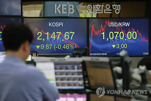 이날 코스피는 전날보다 9.87포인트(0.46%) 내린 2,147.67로 마감했다.