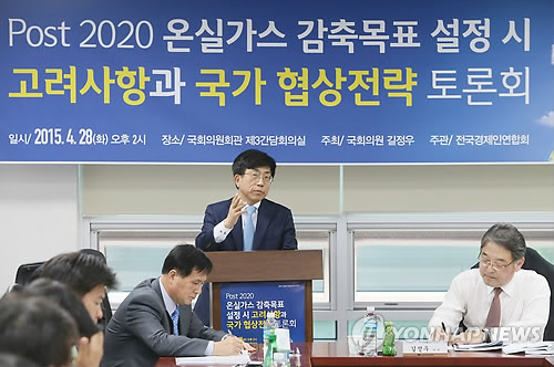(서울=연합뉴스) 고웅석 기자 = 2020년 신(新) 기후체제에 대비하기 위한 온실가스 감축목표 설정과 대응 방향을 논의하는 토론회가 28일 국회 의원회관에서 길정우 새누리당 의원실 주최, 전국경제인연합회 주관으로 열렸다.