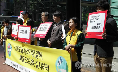 | △ '알바 특별근로감독 실시하라' (서울=연합뉴스) 박정헌 기자 = 알바노조 회원들이 '산재사망노동자추모의날’을 맞아 28일 오전 서울 중구 서울고용노동청 앞에서 산재보험 사각지대에 놓인 아르바이트 노동자의 현실을 고발하는 기자회견을 열고 있다. |