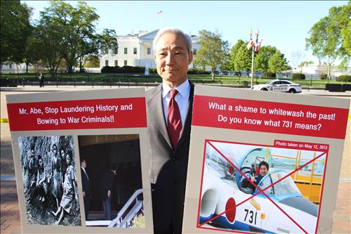 (워싱턴=연합뉴스) 심인성 특파원 = 새누리당 김종훈 의원이 28일(현지시간) 워싱턴DC 백악관 앞에서 아베 신조 일본 총리의 침략역사 및 일본군 위안부 강제동원 부인을 규탄하는 '1인 시위'를 벌였다.