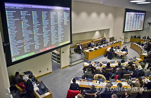| △ 지난해 11월 18일(현지시간) 유엔 총회의 인권문제 담당 제3위원회가 유럽연합(EU) 등 60개국이 공동 제안한 북한 인권 결의안을 찬성 111표, 반대 19표, 기권 55표로 통과시키고 있다. <<연합뉴스DB>> |