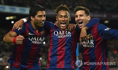 (서울=연합뉴스) 이영호 기자 = 스페인 프로축구에서 최강 전력을 자랑하는 FC바르셀로나의 공격 삼각편대인 MSN(리오넬 메시-루이스 수아레스-네이마르) 트리오가 마침내 세자릿수 득점을 돌파했다.