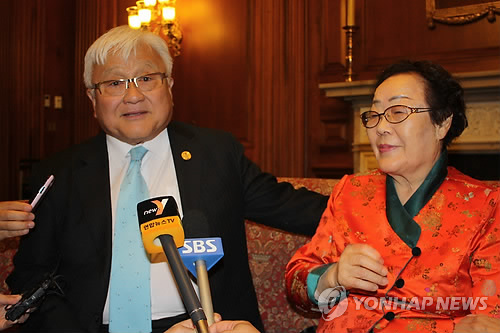 | △ 지난 21일(현지시각) 미국 하원에서 워싱턴 특파원들과 만나 앞으로의 활동계획에 대해 설명하고 있는 마이크 혼다 의원과 이용수 위안부 피해자 할머니 (연합뉴스 자료사진) |