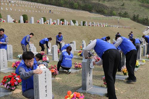 효성 임직원은 비석 닦기, 잡초제거, 쓰레기 줍기 등 환경정리와 태극기 꽂기, 한송이 헌화운동 등을 벌인다.