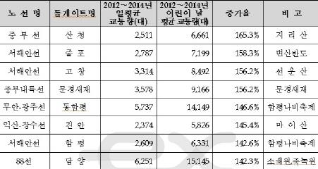 또 변산반도에 접한 줄포톨게이트는 158.3%, 선운산이 있는 고창톨게이트와 문경새재톨게이트는 각각 156.2%, 함평나비축제 관문인 동함평톨게이트는 146.6%, 마이산이 있는 진안톨게이트는 145.4%의 증가율을 기록했다.