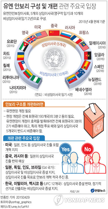 안보리 구조를 개편하려면 유엔헌장 개정이 필요하고, 헌장 개정은 전체 회원국(193개국)의 3분2 동의가 필요하다.