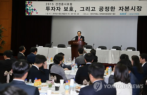 | △ 개회사 하는 최경수 한국거래소 이사장 (서울=연합뉴스) 최경수 한국거래소 이사장이 29일 서울 여의도 한국거래소에서 열린 '2015년도 건전증시포럼'에서 개회사를 하고 있다. (한국거래소 제공) |