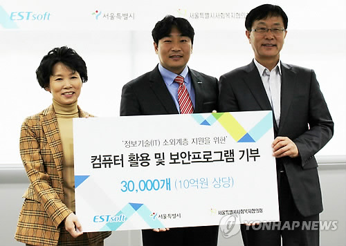 | △ 이스트소프트, 복지시설에 컴퓨터 프로그램 기부 (서울=연합뉴스) 서울시는 이스트소프트와 함께 지역 복지시설 6천800곳에 총 3만 개(10억 원 상당)의 컴퓨터 응용 프로그램을 지원한다고 29일 밝혔다. 서울시와 이스트소프트는 보안프로그램 설치 외에도 복지시설을 이용하는 시민이 정보 소외계층이 되지 않게 무료 컴퓨터 교실도 운영할 예정이다. 이날 서울시청에서 열린 전달식에서 박근수 서울시 복지기획관(왼쪽부터)과 윤태덕 이스트소프트 영업본부장, 이수홍 서울시사회복지협의회 사무총장이 기념 촬영을 하고 있다. (서울시 제공) |